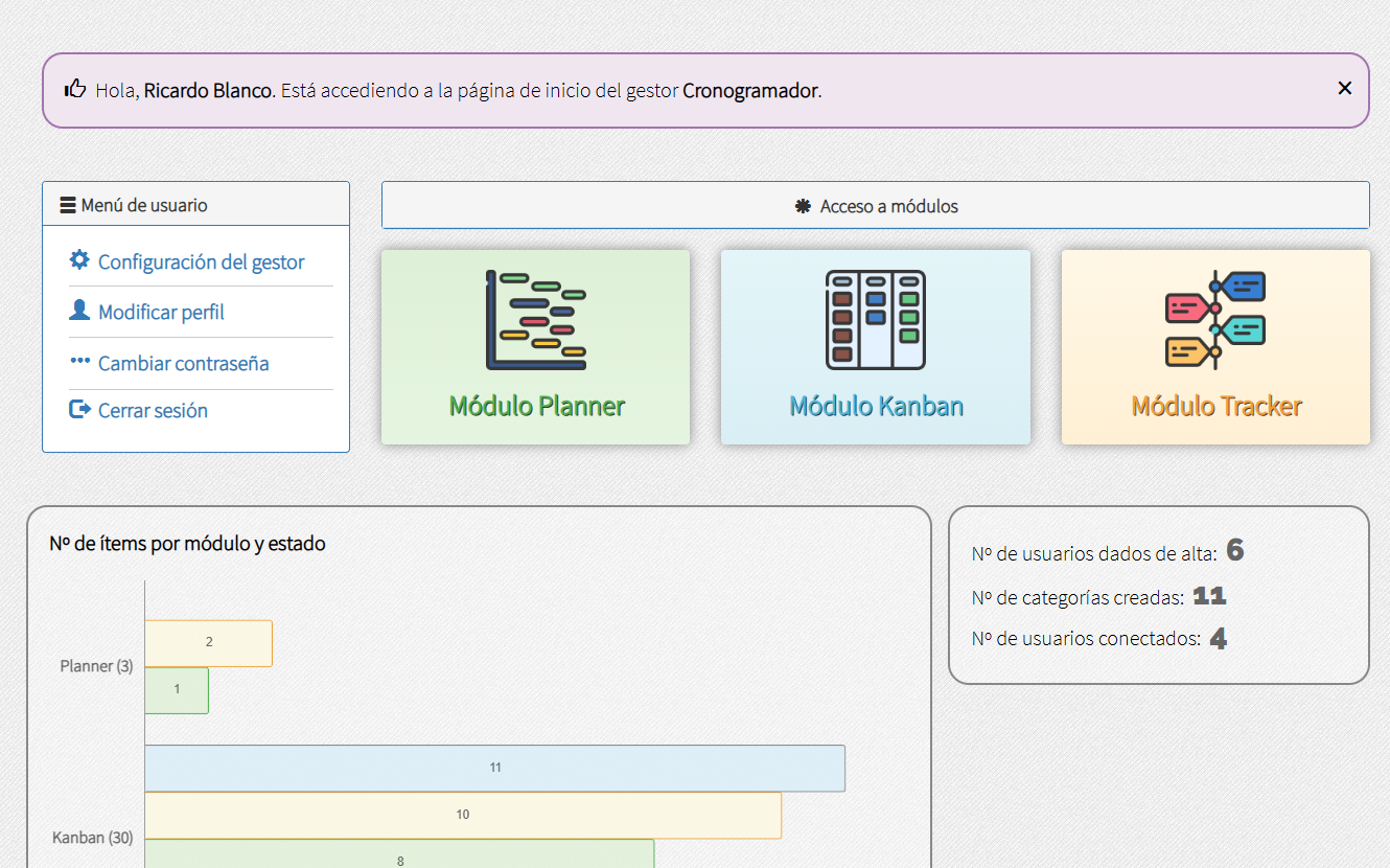 Cronogramador se compone de 3 módulos, esto es, 3 bloques o funcionalidades principales: Planner, Kanban y Tracker. Cada módulo permite generar y gestionar distintos tipos de cronogramas; además, cada módulo puede funcionar y usarse por sí solo, o bien de manera combinada.