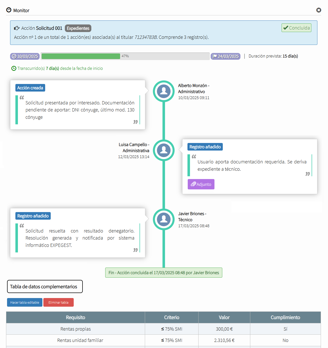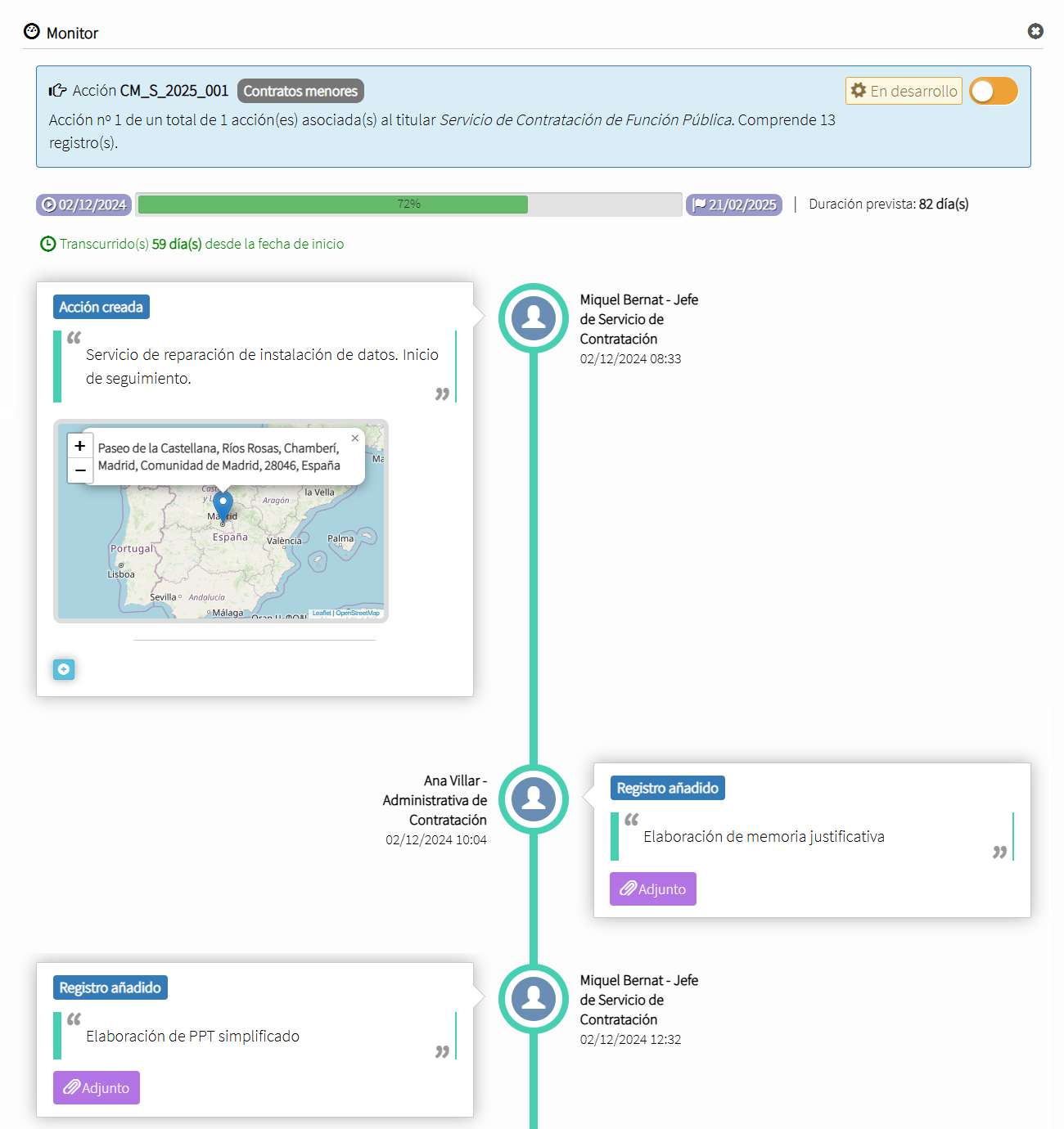 Permite monitorizar expedientes, actividades, trabajos, etc. mediante un desarrollo en formato de time-line o línea temporal vertical, registrando estado, hitos, intervinientes, etc.
